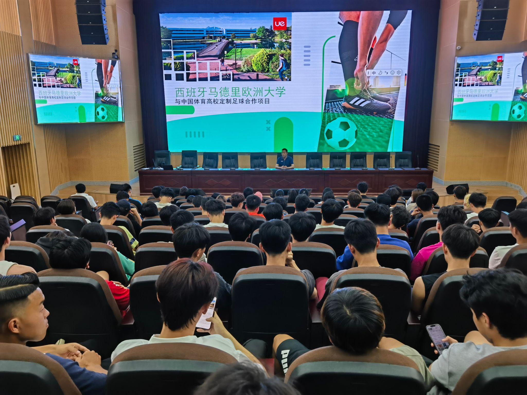 2024年6月5日晚,成都体育学院足球运动学院在新校区多功能厅成功举办了一场宣讲会。此次宣讲会聚焦于西班牙马德里欧洲大学与成都体育学院的足球项目合作,旨在为学生们搭建一个了解海外优质教育资源、拓宽国际视野的平台。