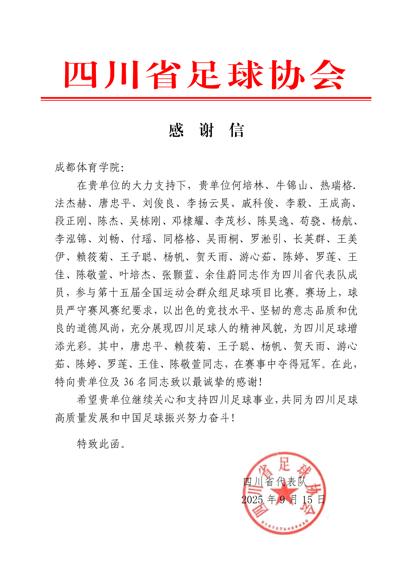 (成都体育学院)第十五届全国运动会群众组足球项目比赛感谢信